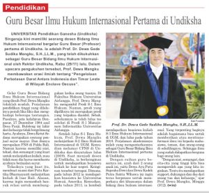 Universitas Pendidikan Ganesha (Undiksha) Singaraja mencetak sejarah baru dengan mengukuhkan Prof. Dr. Dewa Gede Sudika Mangku, S.H., LL.M. sebagai Guru Besar pertama dalam Bidang Ilmu Hukum Internasional. Pengukuhan tersebut berlangsung pada Rabu, 29 November 2023, dan disertai orasi ilmiah berjudul “Pengelolaan Perbatasan Darat Antara Indonesia dan Timor Leste di Wilayah Enclave Oecusse.”
