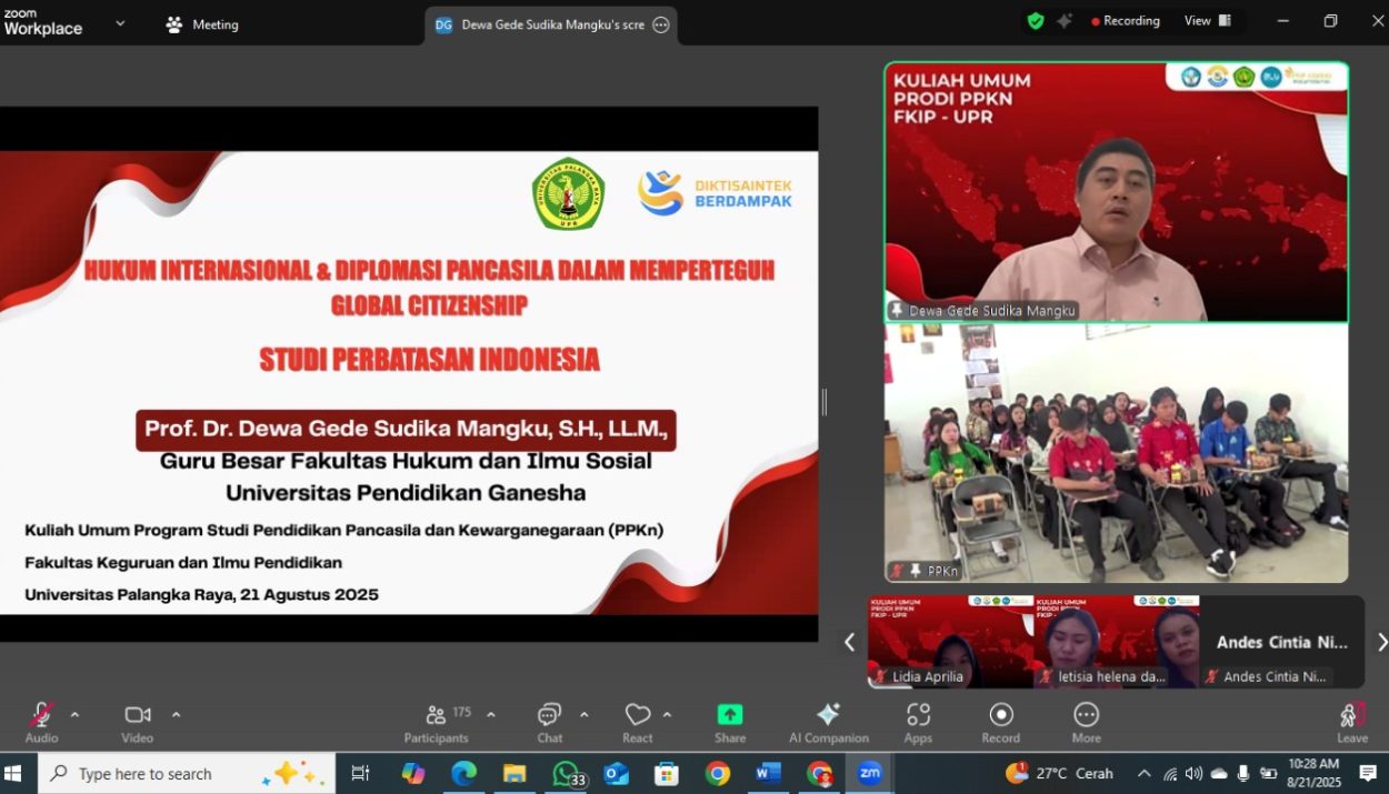 Palangkaraya, 21 Agustus 2025 – Program Studi Pendidikan Pancasila dan Kewarganegaraan (PPKn) Fakultas Keguruan dan Ilmu Pendidikan (FKIP) Universitas Palangkaraya (UPR) dengan penuh kebanggaan menyelenggarakan Kuliah Umum bertajuk “Hukum Internasional dan Diplomasi Pancasila dalam Memperteguh Global Citizenship”. Acara ini digelar secara hybrid, yaitu luring di Aula FKIP Universitas Palangkaraya dan daring melalui Zoom Meeting, pada Kamis, 21 Agustus 2025 pukul 08.30 WIB hingga selesai.