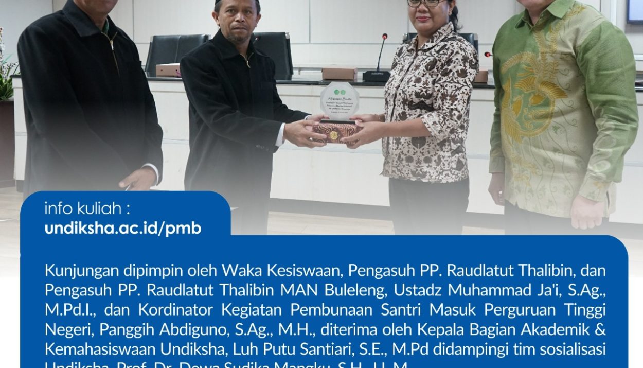 Singaraja | Prof. Dr. Dewa Gede Sudika Mangku, S.H., LL.M. berkesempatan menjadi Narasumber pada saat MAN Buleleng hadir secara langsung ke Undiksha. dimana Prof. Dewa Mangku menjelaskan terkait dengan Undiksha, Kampus terakreditasi unggul, berprestasi, dan siap memberikan kamu pengalaman global! Kunjungan ini jadi momen penting bagi para santri untuk mengenal kampus, melihat peluang, dan memantapkan langkah ke perguruan tinggi.